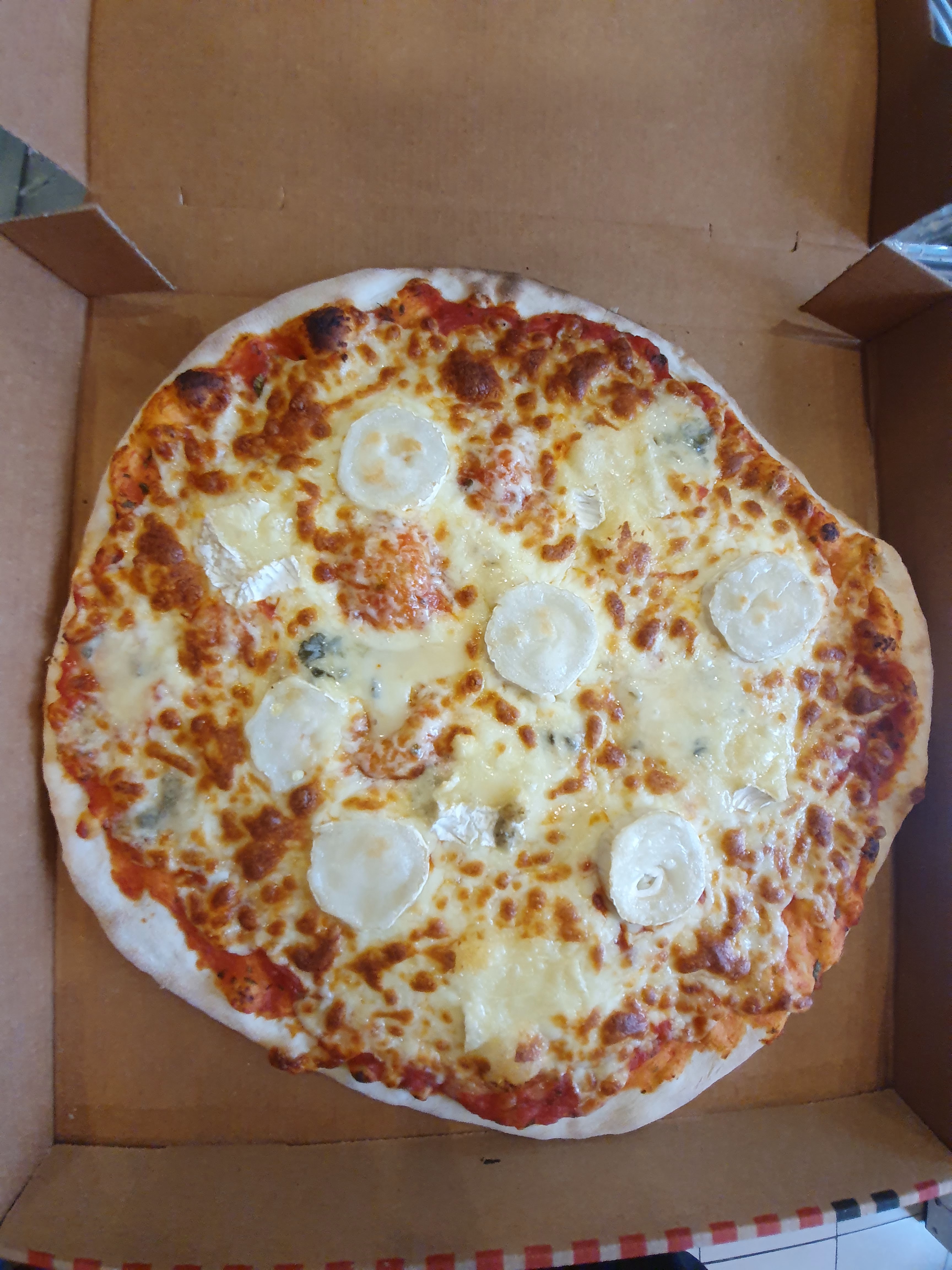 Personnellement nous sommes déçu au vue des commentaires précédents qui sont positifs nous nous le sommes pas dutout nous avons commandé 2 pizza ( froide ) une kebab beaucoup de gruyère d' olive puis de poivrons mais le poulet deux morceaux qui se battent en duel puis mon compagnon n' avait pas de jambon de dinde sur la pizza hors nous avons commandé celle ci en revanche le tiramisu était bon