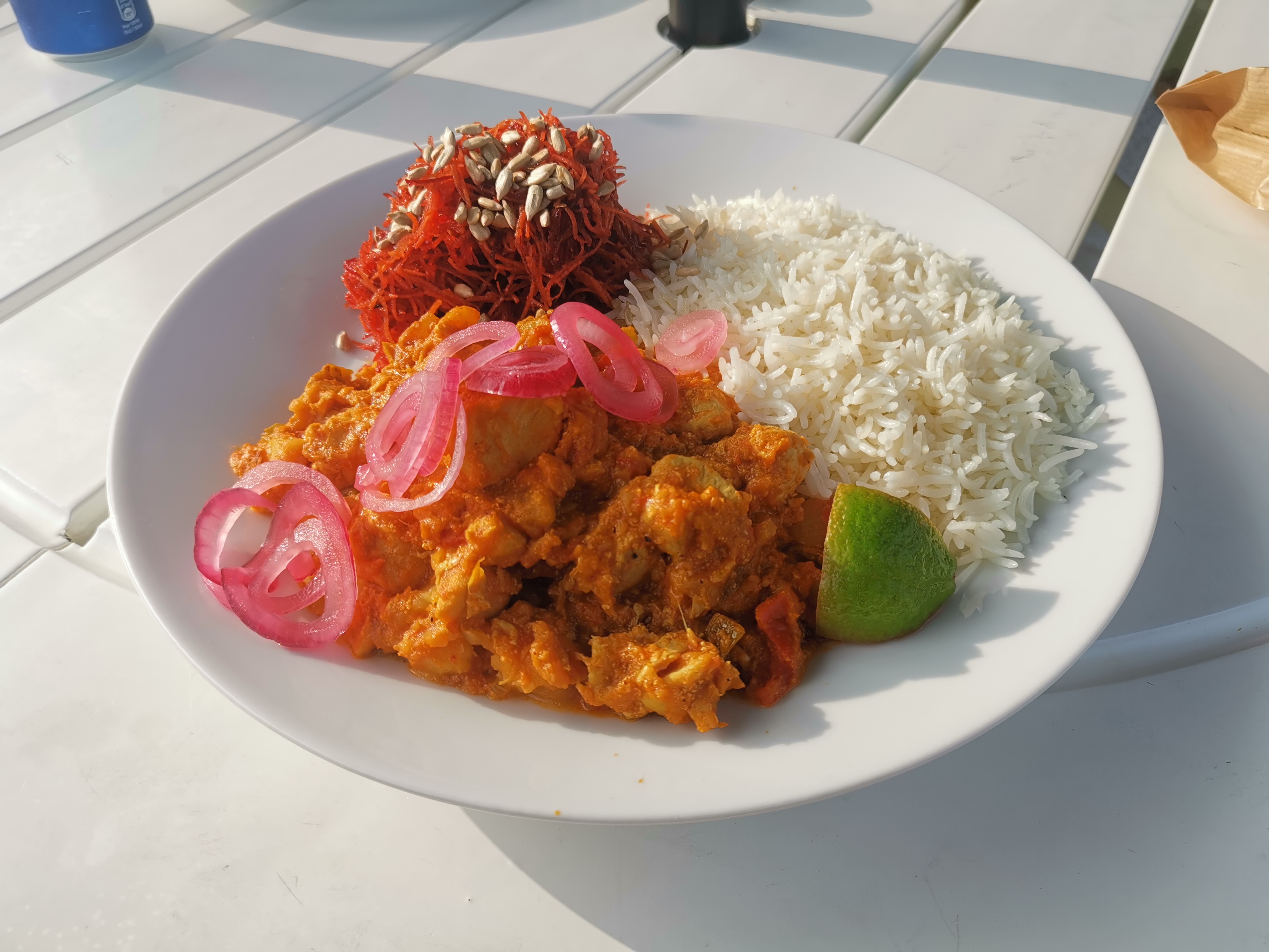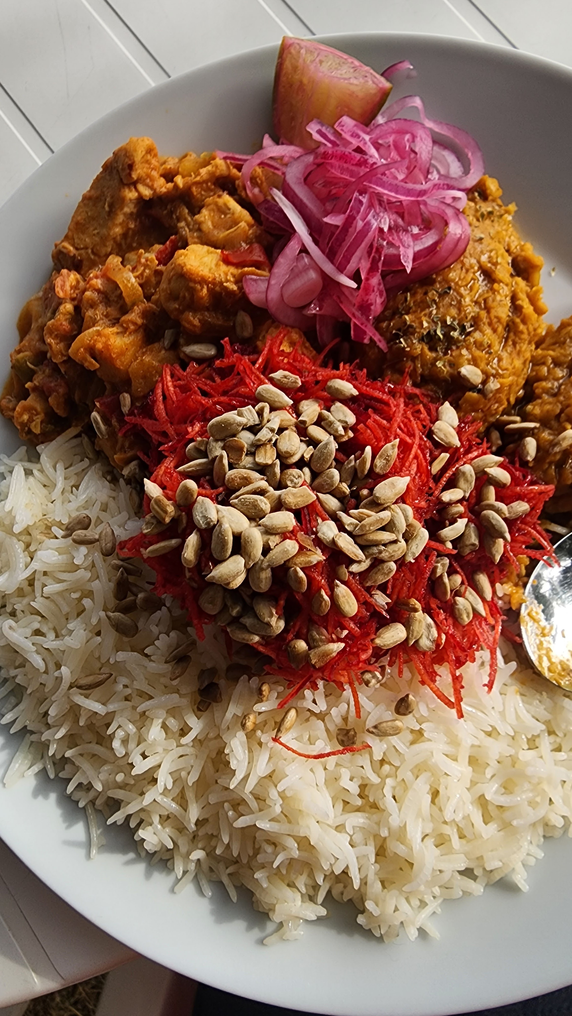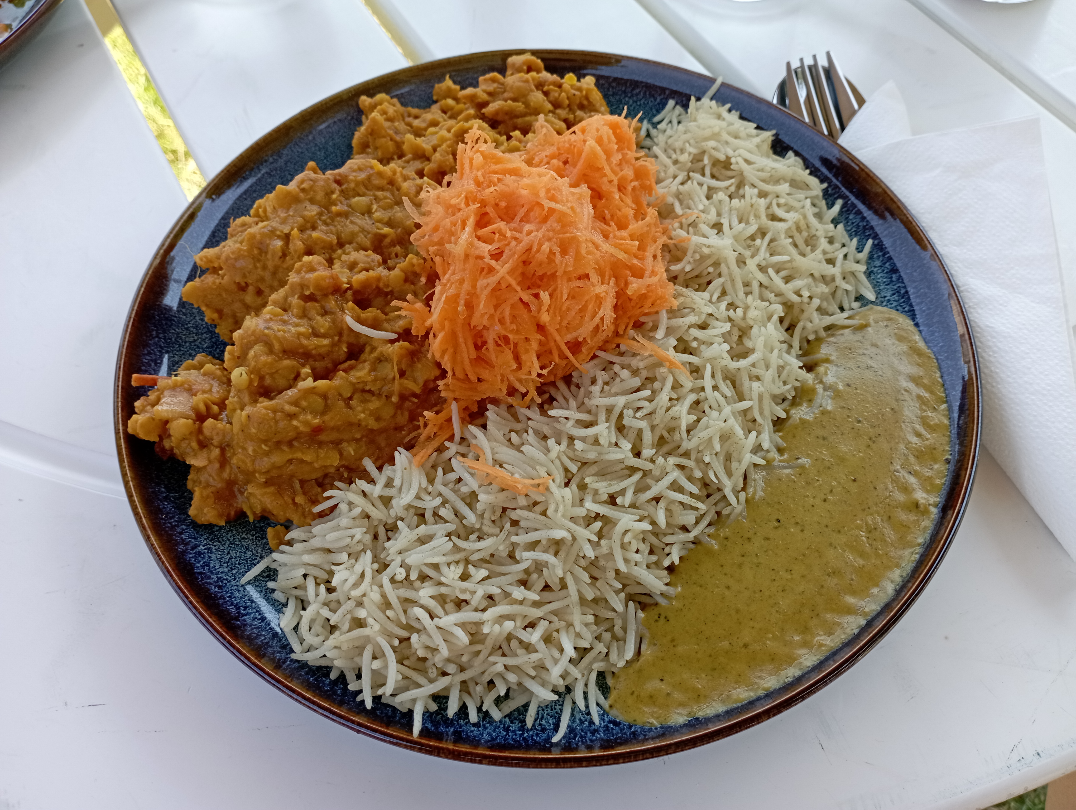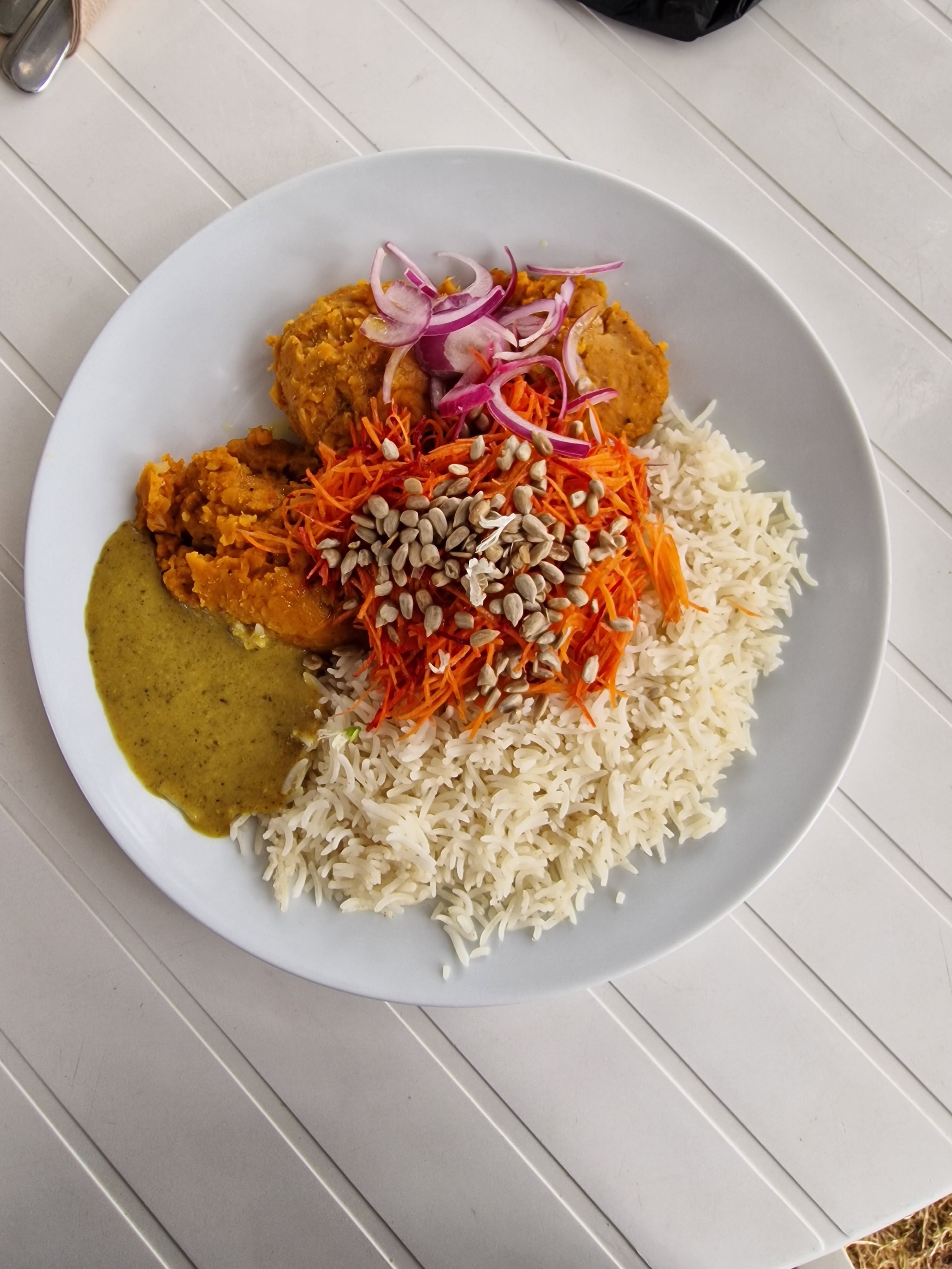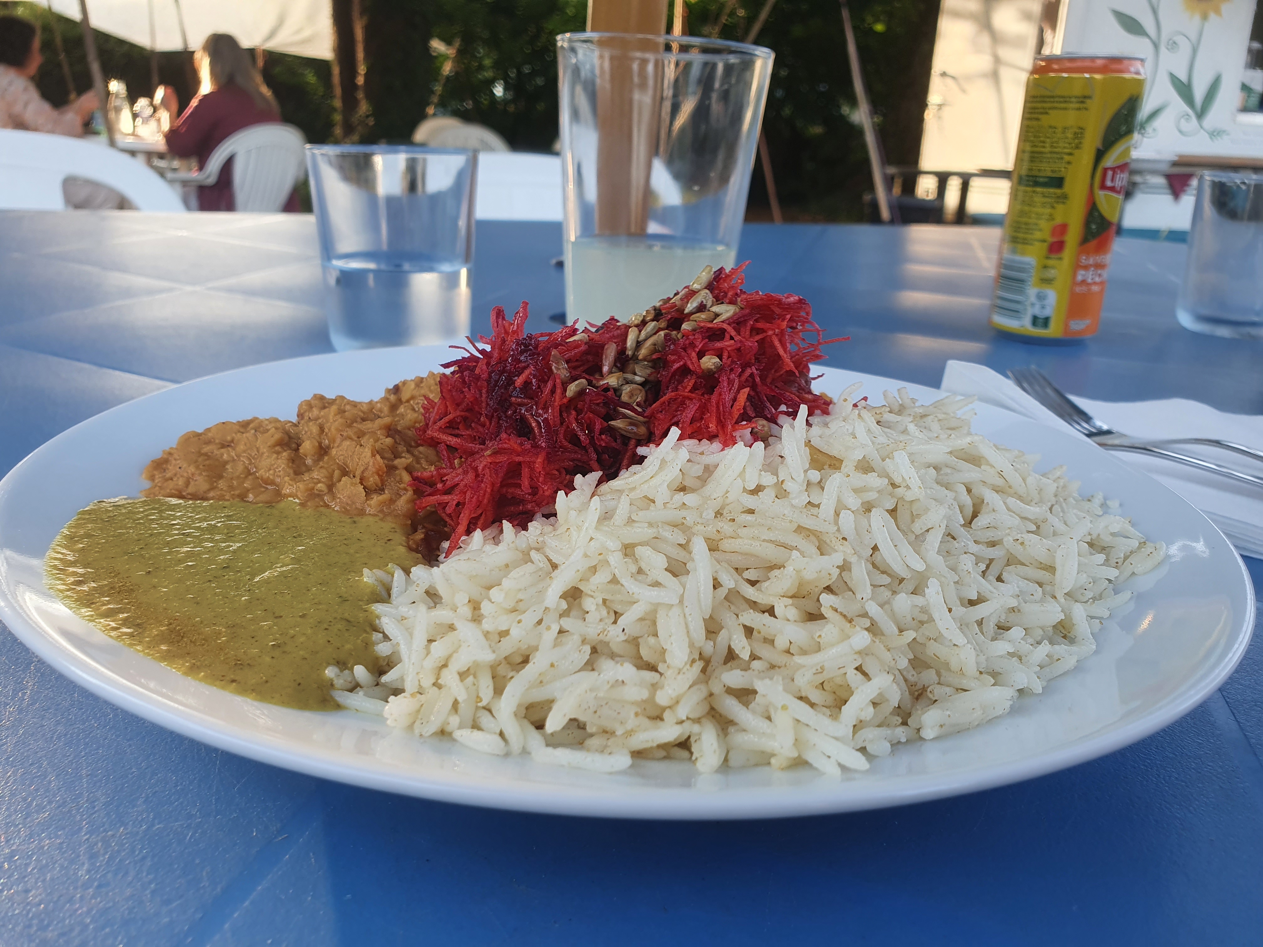 J'y suis allé par une chaude journée d'été, l'emplacement est tellement mignon et les gens qui y travaillent sont absolument adorables. Mes parents et moi avons eu le dal de lentilles (que vous pouvez voir sur la photo) accompagné de riz et d'une salade verte avec une délicieuse vinaigrette. Incroyable! Ma sœur a pris le poulet au curry et l'a aimé aussi même si elle est généralement très difficile en matière de nourriture. 10/10 recommande surtout pour les journées chaudes et ensoleillées !