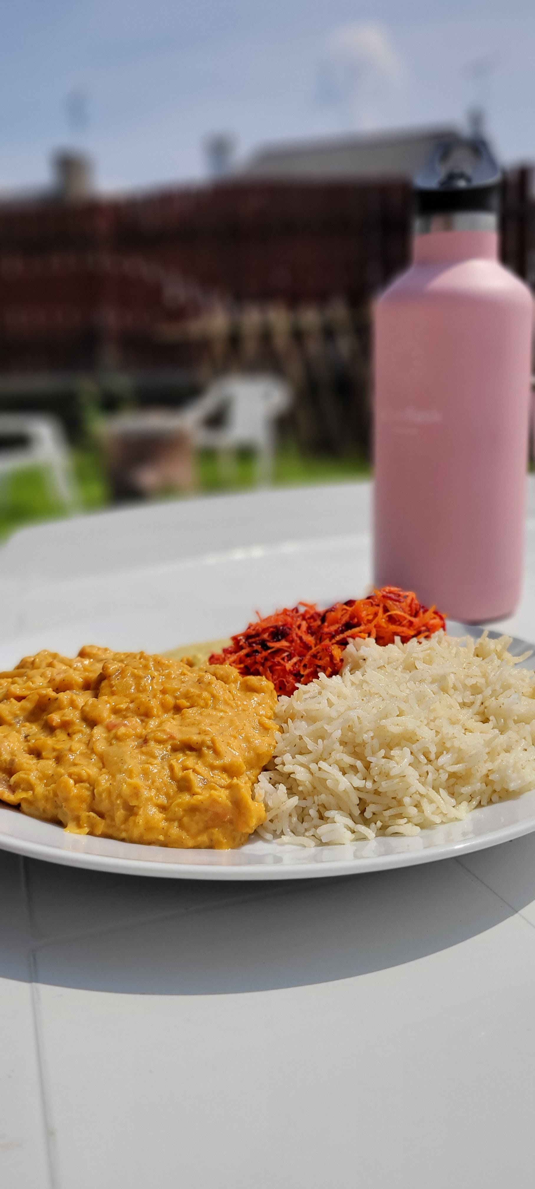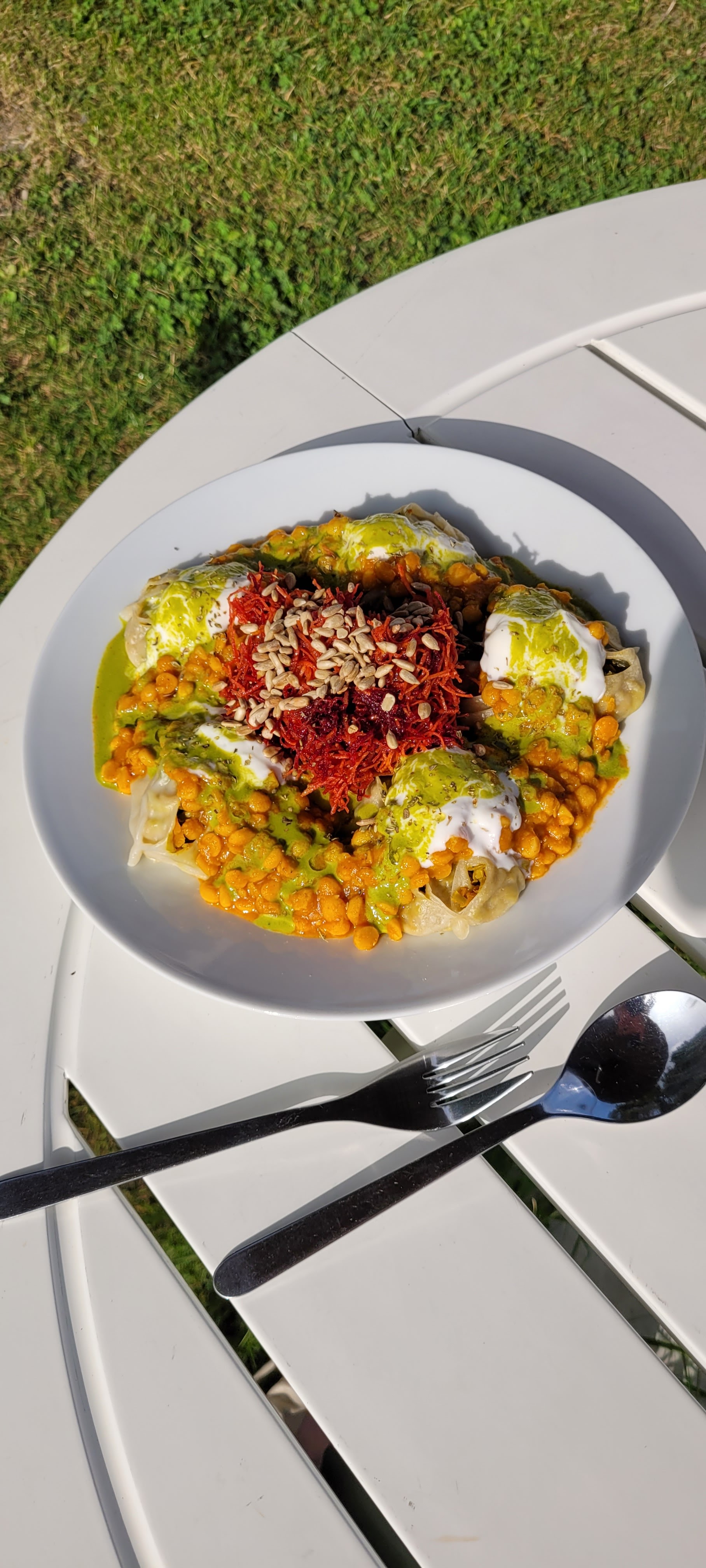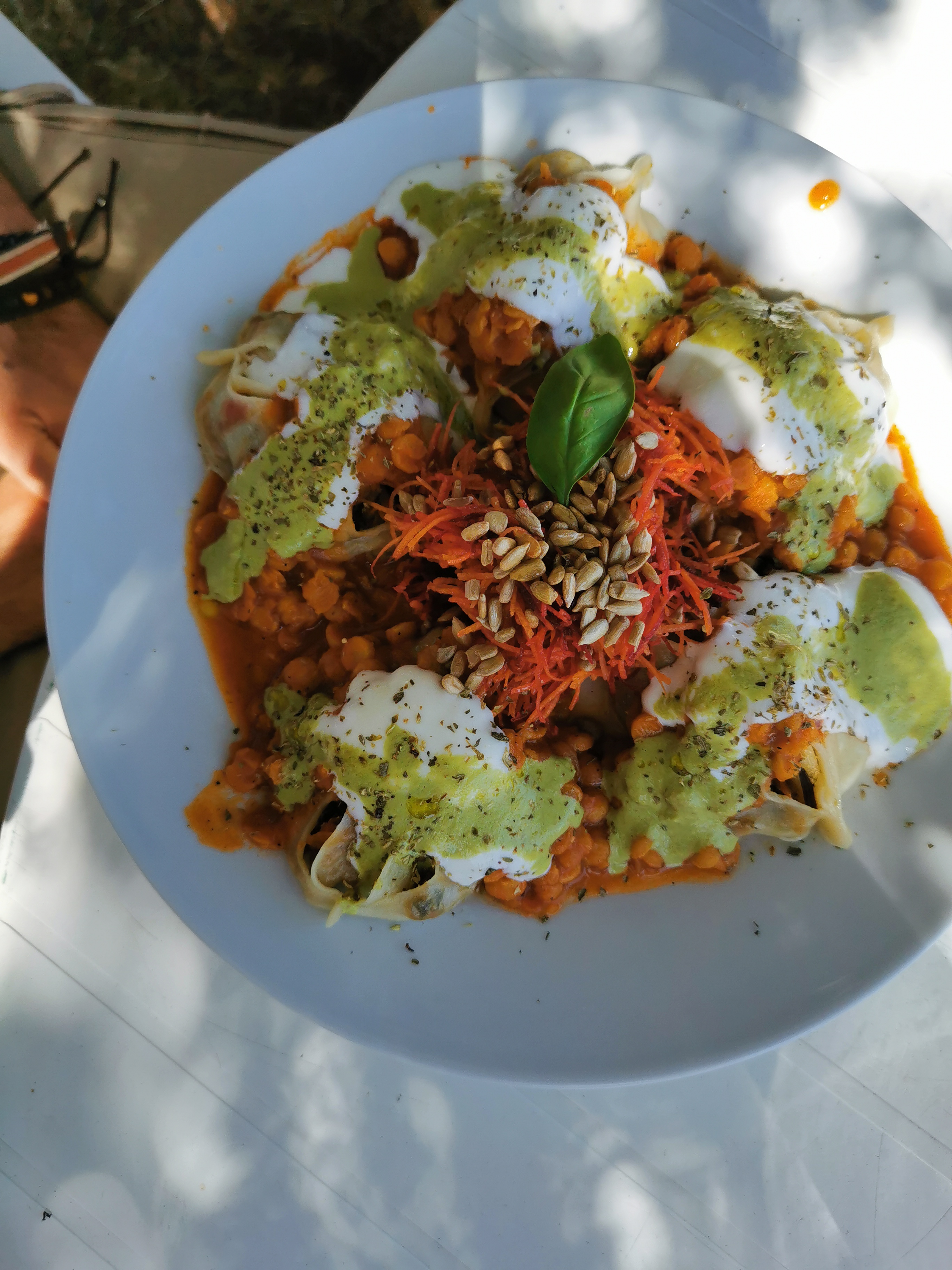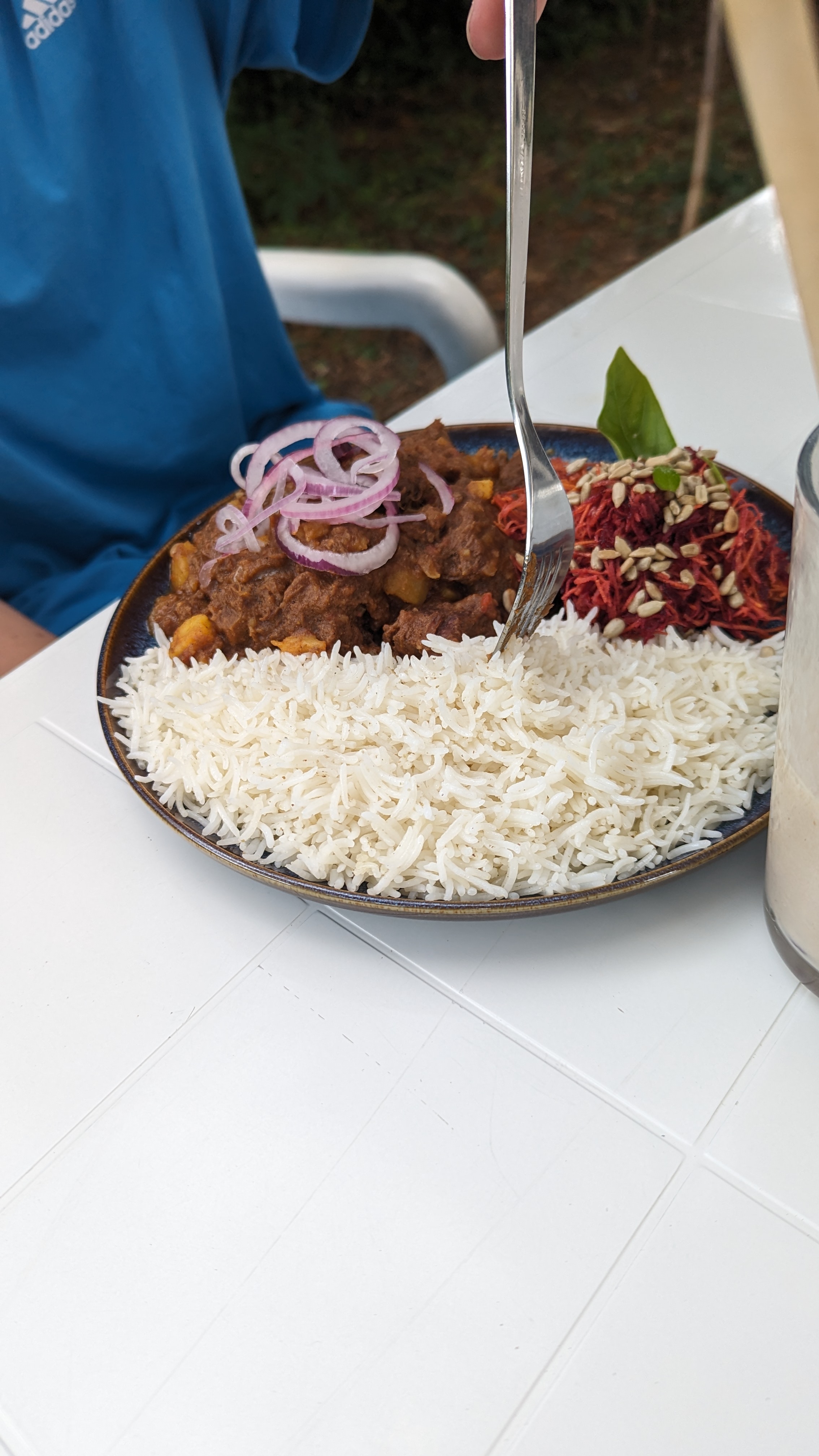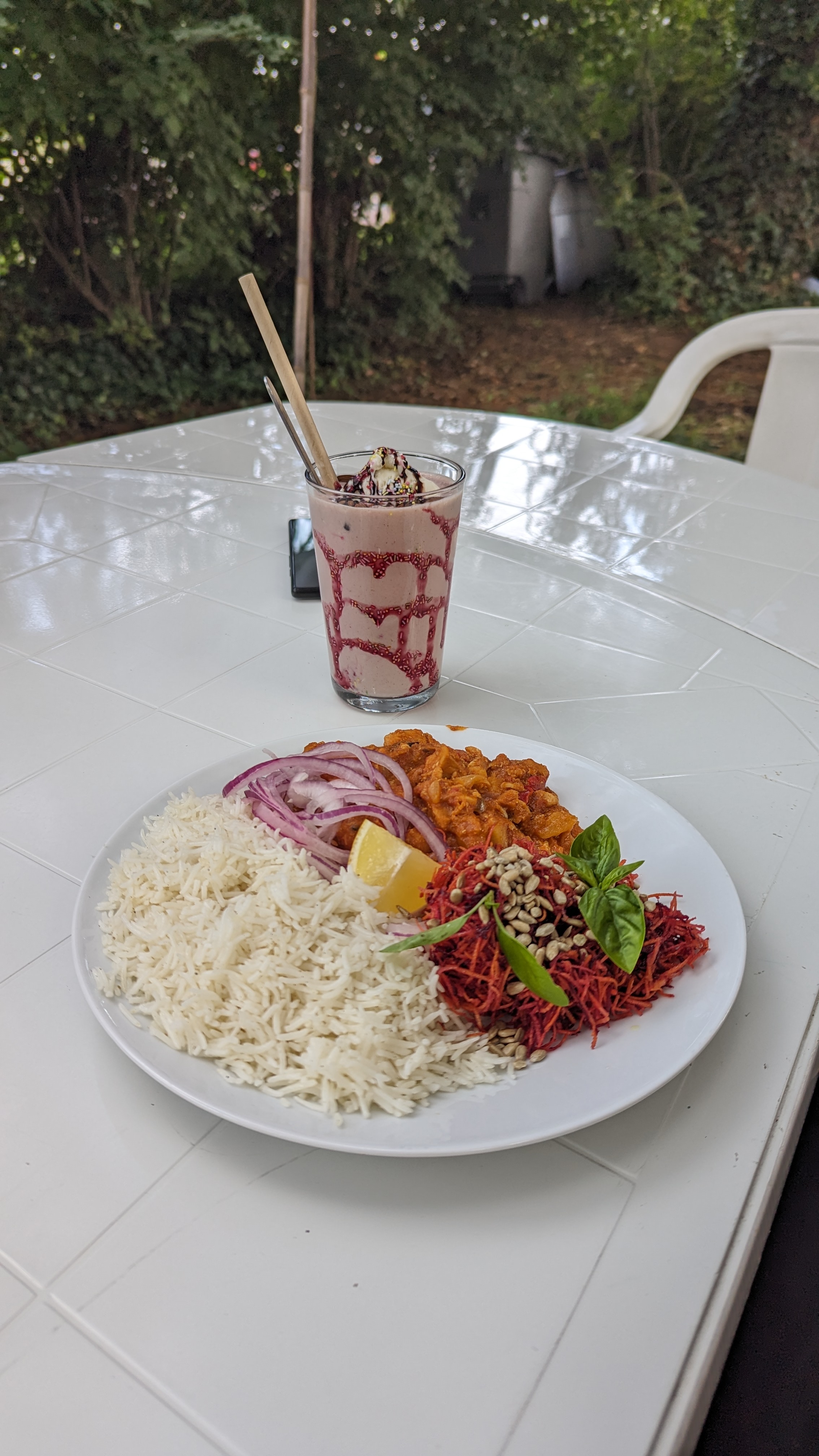 J'y suis allé par une chaude journée d'été, l'emplacement est tellement mignon et les gens qui y travaillent sont absolument adorables. Mes parents et moi avons eu le dal de lentilles (que vous pouvez voir sur la photo) accompagné de riz et d'une salade verte avec une délicieuse vinaigrette. Incroyable! Ma sœur a pris le poulet au curry et l'a aimé aussi même si elle est généralement très difficile en matière de nourriture. 10/10 recommande surtout pour les journées chaudes et ensoleillées !