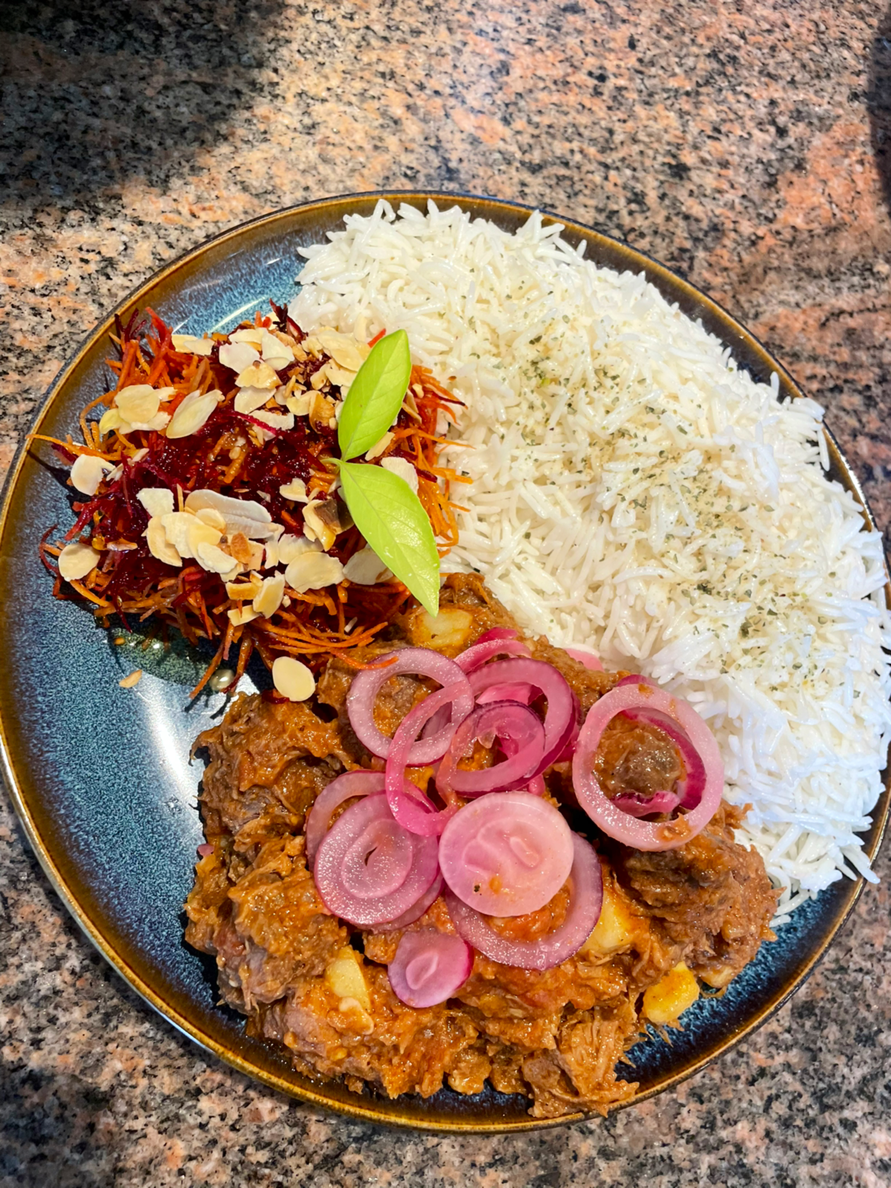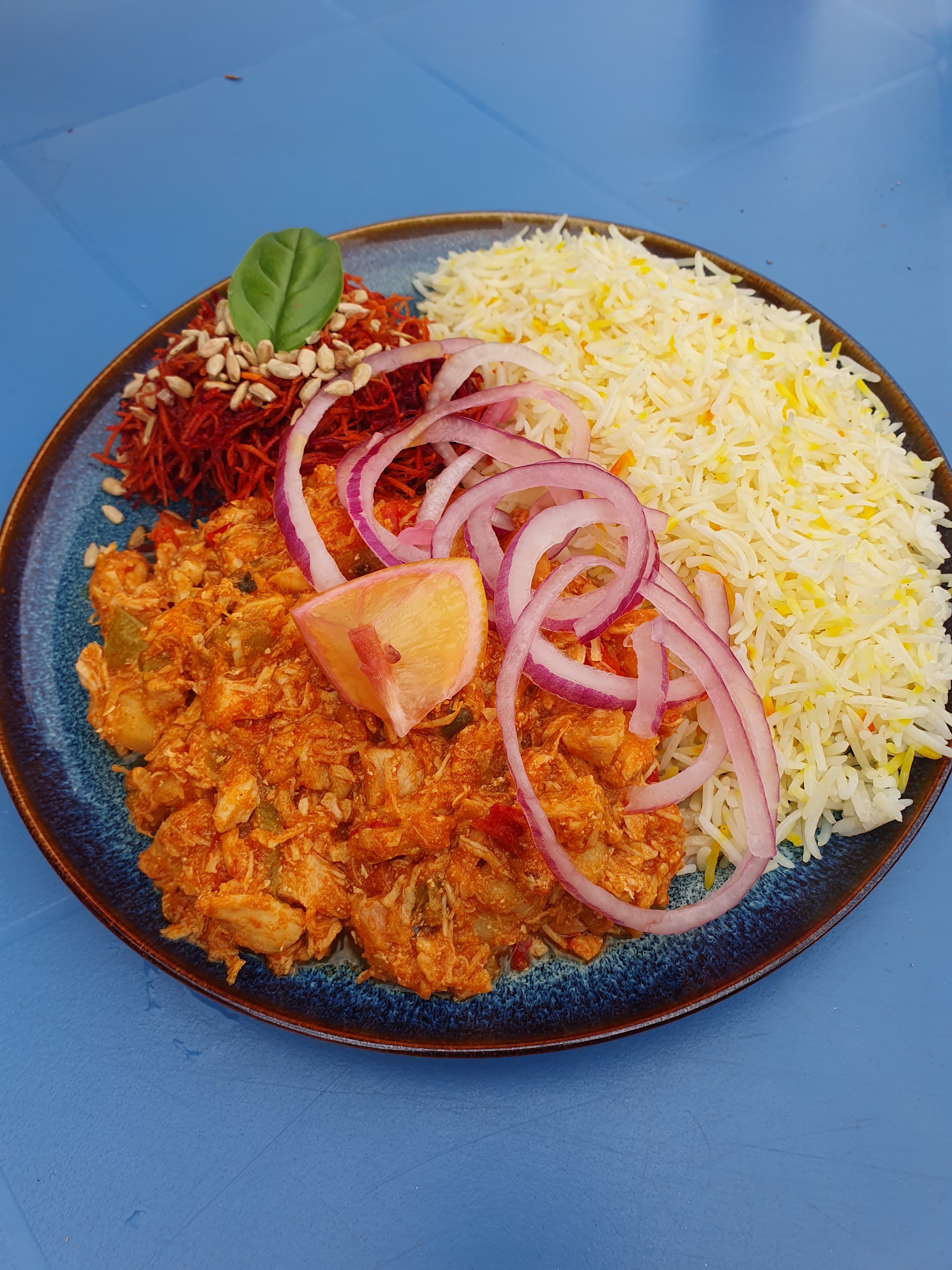 Nourriture absolument délicieuse. J'ai pris le plat de poulet et mon partenaire a pris l'agneau. Les deux étaient incroyables. Plein de saveurs délicieuses. Des gens vraiment sympathiques. Si nous restions ici plus longtemps, nous reviendrions certainement. Merci beaucoup 😊