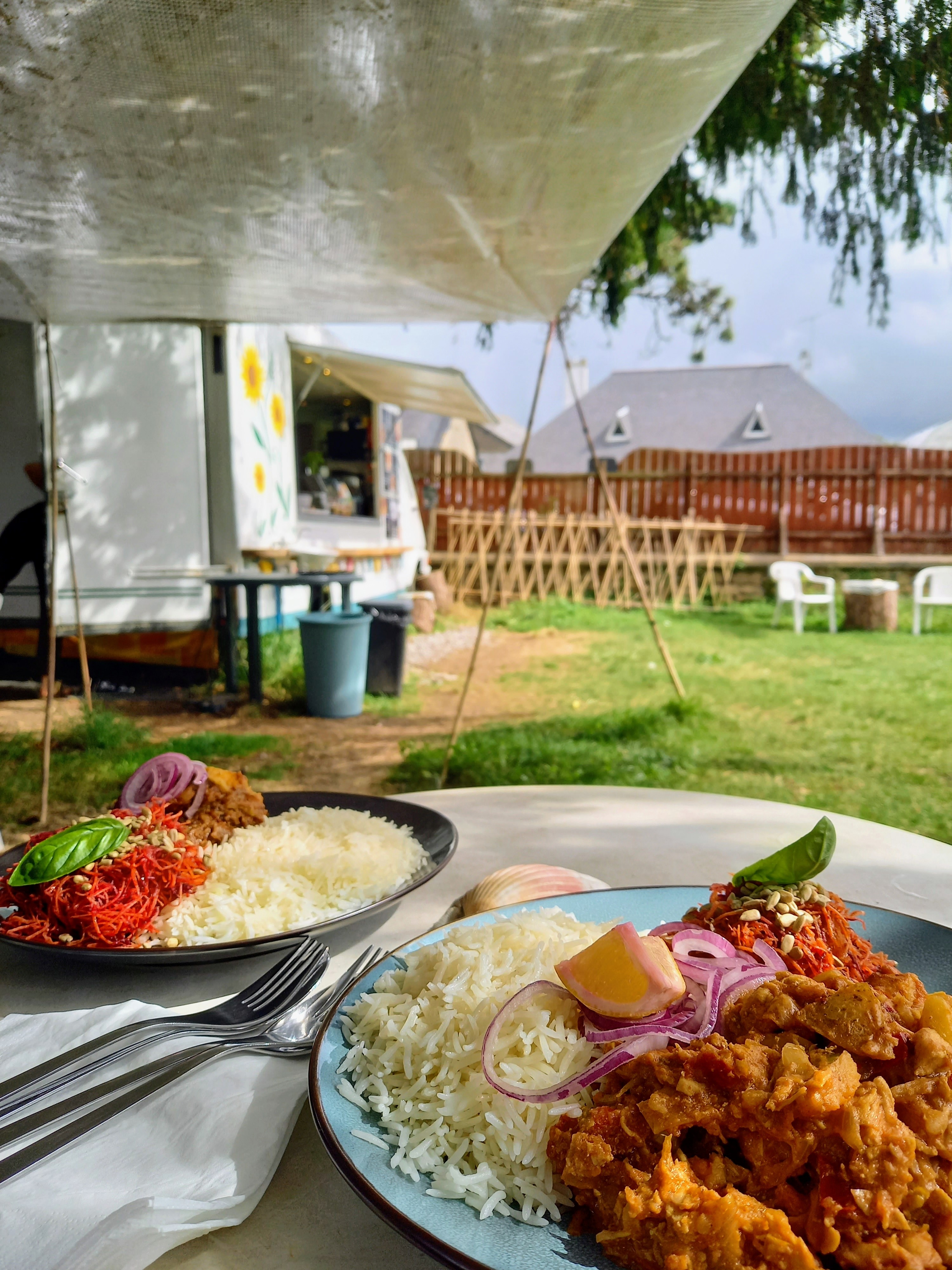 Ambiance très simple mais chaleureuse avec tables et chaises de jardin sous les arbres. Le restaurant est en fait un gros food truck. La nourriture était vraiment délicieuse. Nous y sommes arrivés vers 14h. Il ne restait qu'un peu de bœuf des menus spécifiés. Les menus restants avec poulet ou végétarien étaient déjà épuisés. (Ce qui parle de la qualité dans ce cas).