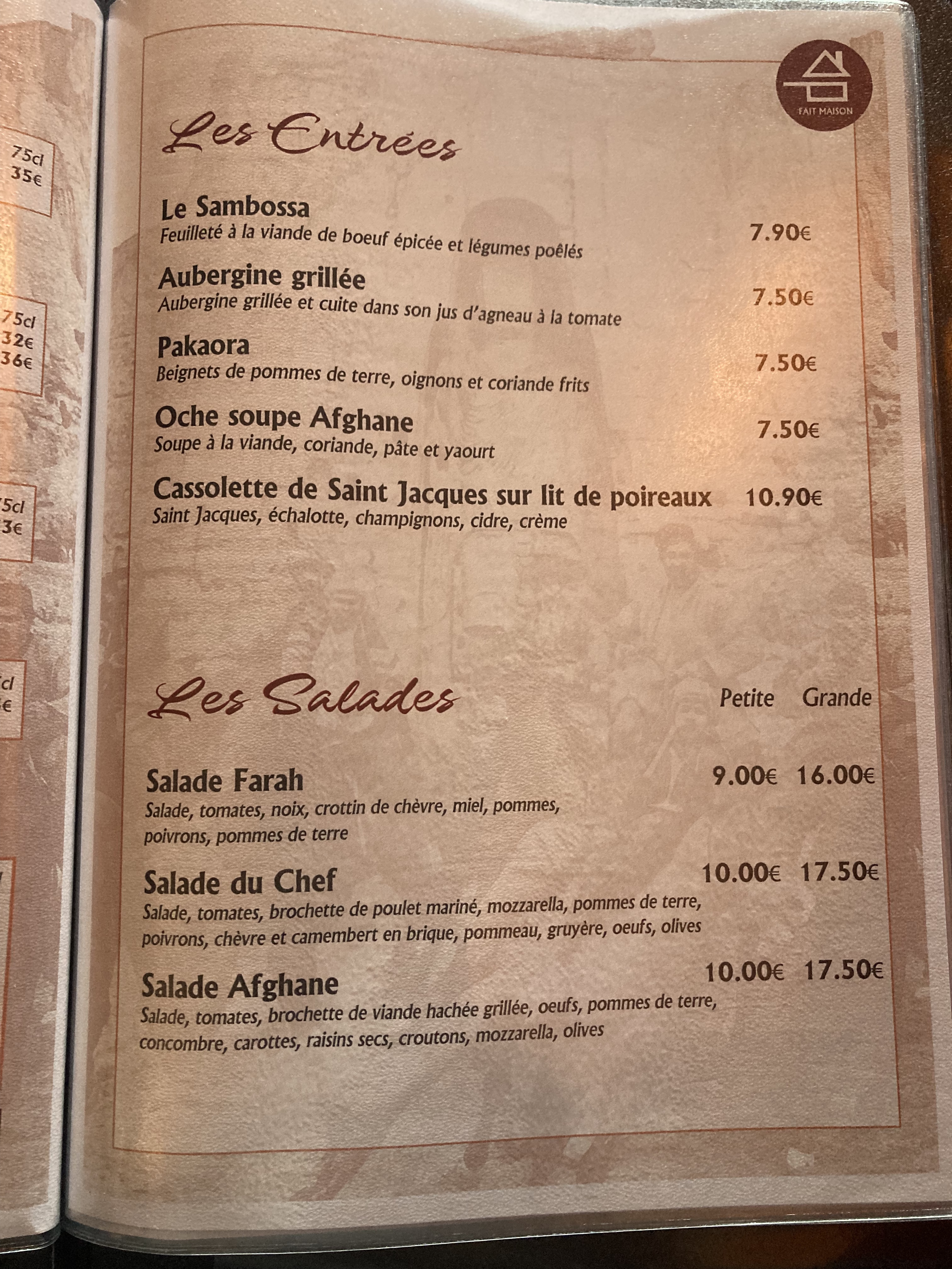 Restaurant très agréable. Les plats sont au grande partie influencés par les goûts normands (frites, sauce camembert) mais l’esprit afghan est toujours là. Serveuse efficace.