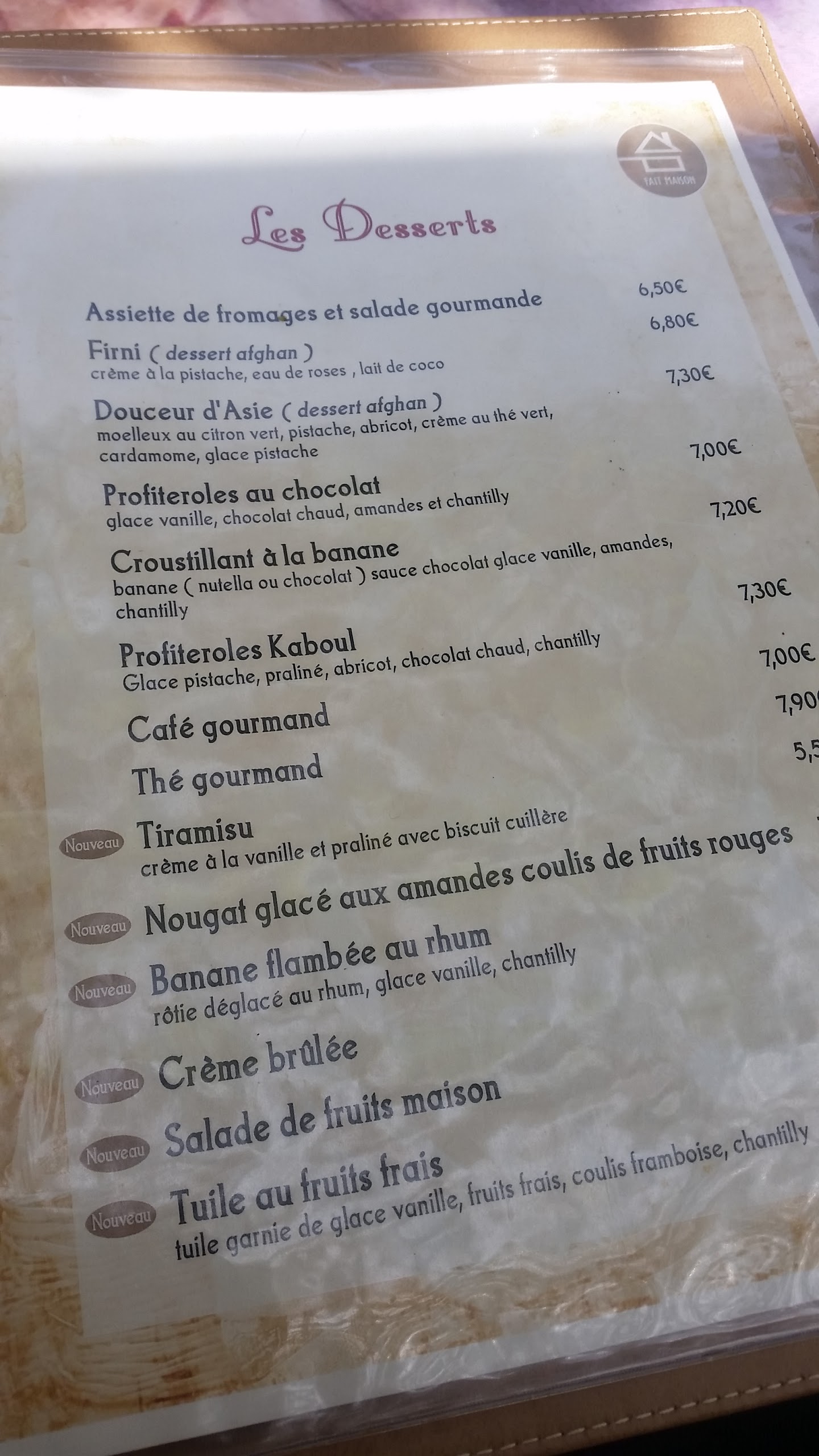On est pas du tout à Kaboul à part quelque 2/3 plats originaux (brochette tandouri..agneau kabili .) le reste c'est occidentaux.. Mais c'est bon, rapport qualité prix C moyen..