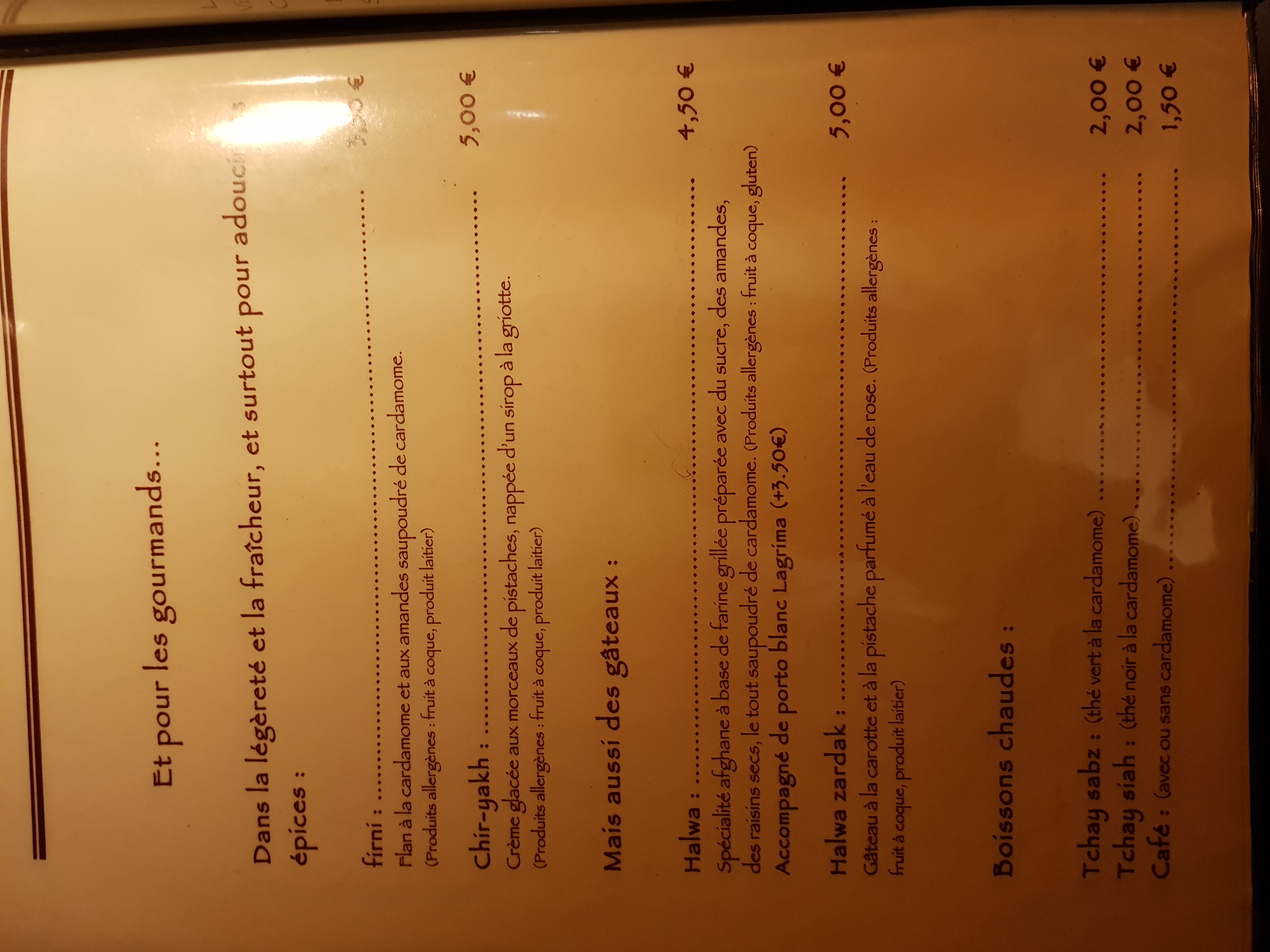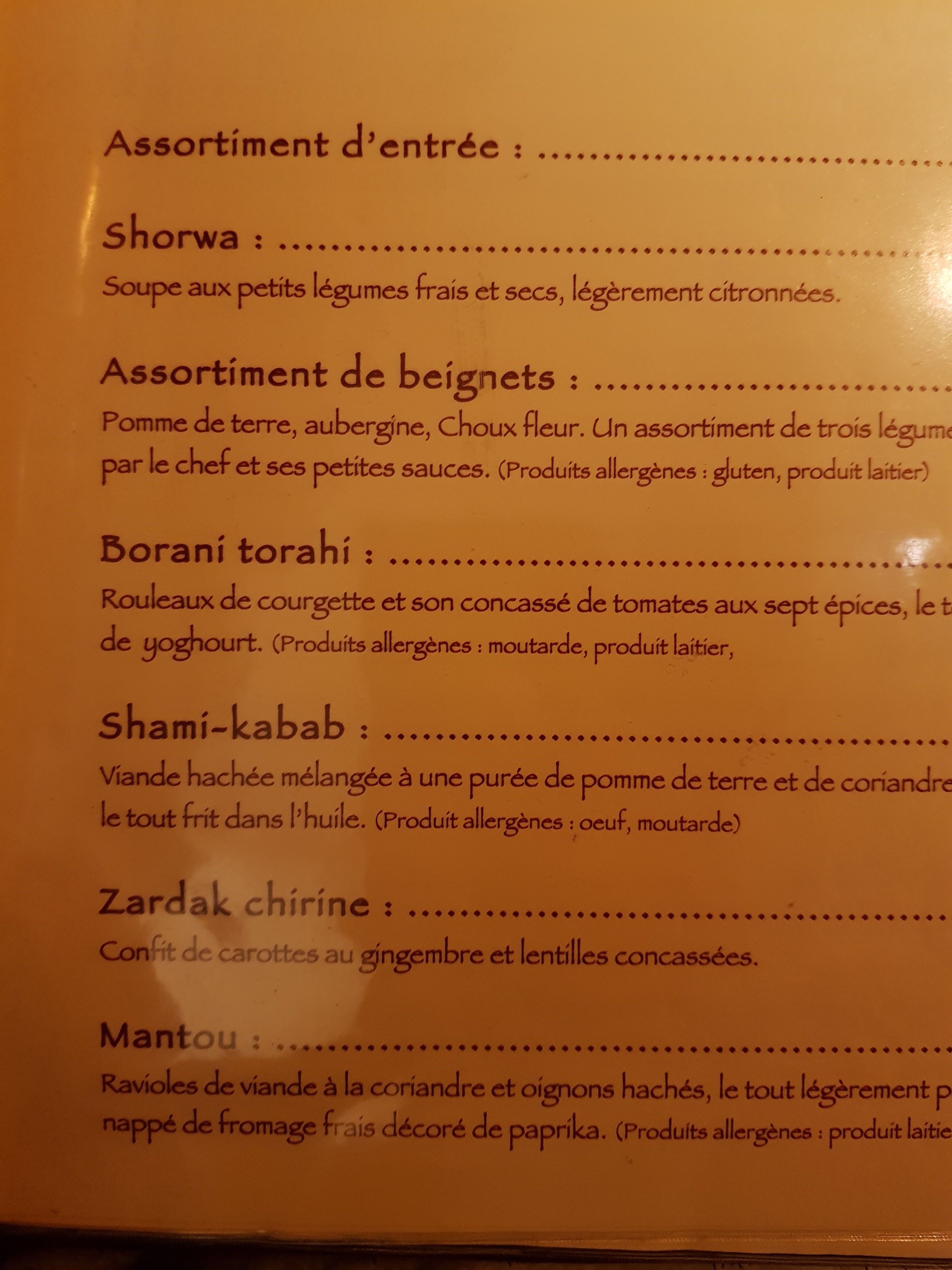 Coup de coeur pour les entrées végétariennes/vegan. Coup de coeur aussi pour le Soir et le thé glacé maison, très bonnes boissons ! Très bons desserts. Par très typiques. Le restaurant est très bien décoré, au style Afghan. Musique de fond chaleureuse et traditionnelle.