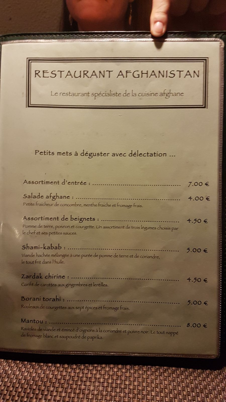 Leur description correspond parfaitement : cuisine afghane dans un cadre cosy ! Plats délicieux : raffinés, épicés, originaux... Le menu change de temps en temps et un plat spécial est servi les vendredis et samedis seulement (à tester !). Accueil chaleureux, service rapide. Ambiance à la fois tamisée et décontractée : convient aussi bien pour un dîner en amoureux, que pour une table de 4 à 6 personnes (surtout si la table ronde de l'arrière salle est disponible) ou un groupe plus important dans la salle du bas. Vivement recommandé !!!