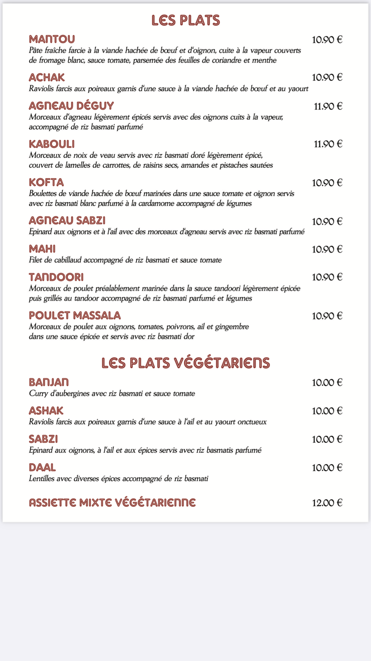 Nous avons choisi ce restaurant pour notre dernière nuit à Rouen et n'avons pas été déçus ! C'était génial d'essayer la cuisine afghane - mon partenaire et moi avons tous deux adoré nos repas, et pour moi, en tant que végétarien, il y avait un très large choix d'options parmi lesquelles choisir. Accueil très chaleureux et service amical du propriétaire, et excellent rapport qualité/prix également.